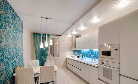 Перечень осветительных приборов нужно согласовать с бригадой, которая будет проводить монтаж. Для освещения кухни не подойдут светильники, которые сильно нагреваются. Они могут изменить цвет полотна и даже оплавить его.